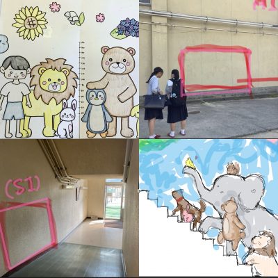 夏季休暇の宿題として、一人ひとつのイラスト案を考えました。それを発表し、選ばれた二つの案をもって、再び鳴尾小学校を訪問しました。小学校に許可をいただくためにそれぞれ三箇所まで候補を考えました。これからどれくらいのペンキが必要だったり、どのような資材が必要なのかを計算し、壁画アート開始に向かいます!