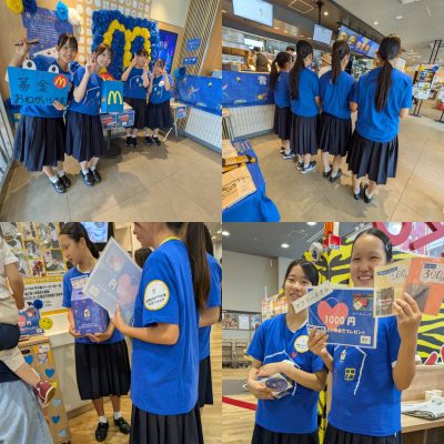 SOAR探究コース発足と同時に、探究活動において本校では武庫川女子大学 経営学部と連携し、「サステナビリティ人材育成プログラム」始動しました。本プログラムを通して、参加生徒はドナルド・マクドナルド・ハウスでのボランティア実習やマクドナルドの店舗実習を経ました。そして、いよいよその生徒たちは6店舗に派遣され、募金活動に取り組みました。
