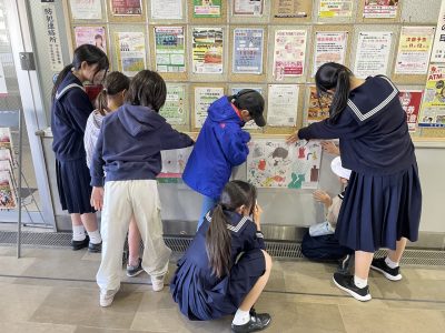 この日も高校生が小学校へ到着する頃には、児童たちがわくわく出迎えてくれ、それぞれ計画したところへポスター掲示に行きました。
