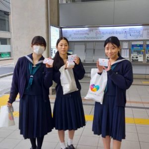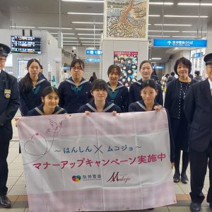 11月5日(水)鳴尾・武庫川女子大前駅にて、はんしん×ムコジョ乗車マナー向上委員会がマナーアップキャンペーンを実施しました。風紀委員会のメンバーが中心となって、「思いやりの心」というメッセージの入ったティッシュを笑顔で配布し、マナー向上を呼びかけました。
