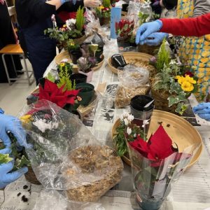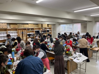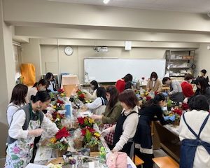 今年も、株式会社万花園の阪上氏をお迎えして、クリスマスやお正月用のお花のアレンジメントをしました。