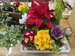 今年は、ポインセチア、ジュリアン、シクラメン、パンジー、アイビー、シルバーレース、葉ボタン、などのたくさんのお花で寄せ植えをしました。