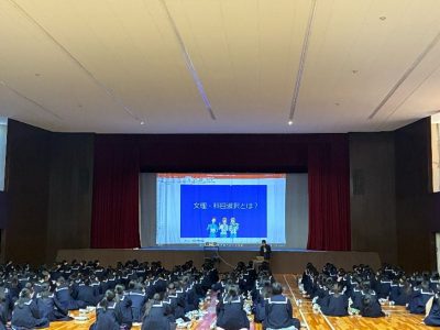 講演では、文理・科目選択の重要性にも触れ、単なる好き嫌いで選ぶのではなく、将来やりたいことや学びたい分野を意識して選ぶことが大切であるとお話下さいました。実際に、職業や学問を十分に調べずに選択した結果、大学入学後に後悔したケースも紹介され、生徒たちは進路選択の難しさと重要性を実感しました。また、スマートフォンを例に身近な興味から広がる学問分野を紹介し、日常生活の中にも進路を考えるヒントがあることを伝えてくださいました。進路選択のためには、将来の目的をしっかり持つことが大切であることを学んだ講演でした。