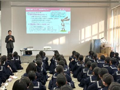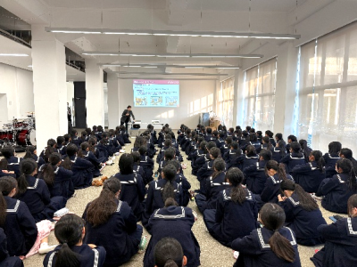 「社会で活躍するためのスキル実践 ~中学生のうちに身につけてほしいチカラ~」をテーマとした講演を行いました。社会の変化に対応するために必要な力として、課題を発見し、解決していく力を挙げられ、身近な生活の中で「なぜだろう?」と疑問を持ち、小さな気づきを行動につなげることが、主体性を育む第一歩になるとお話下さいました。