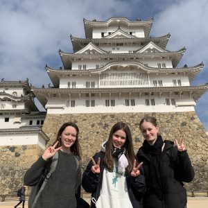 ニュージーランド・ランギオラ校研修生3人が、姫路城見学に行ってきました。英語ガイドの山本さんに、楽しく詳しく説明を受けながら、お城の内外と天守閣の最上階まで、さらに好古園の日本庭園を巡りました。お城の構造や日本史などについても深く学べる充実の学習ツアーになりました。昼食は園内レストランで和食、帰りに市内の老舗和菓子店での試食も、重要な体験学習の1つでした。
