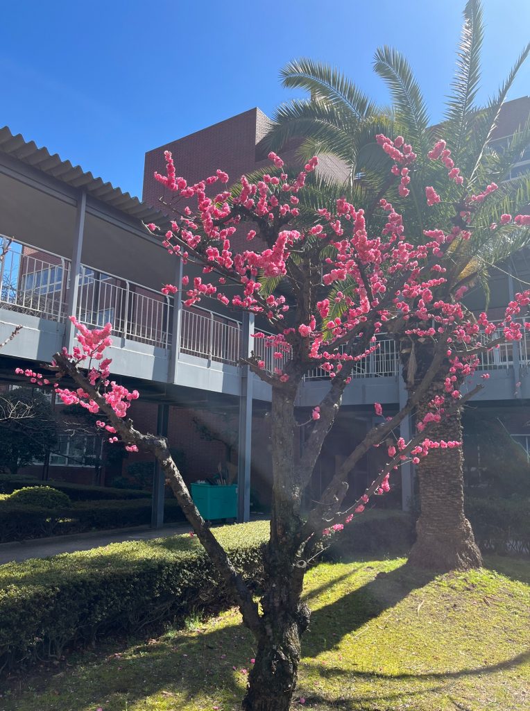 校内の梅の花がきれいに咲き始めました。まだ寒い日が続いていますが、白やピンクの花が春の訪れを知らせてくれています。