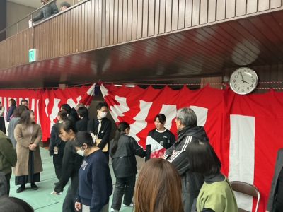 放課後、先生方やバドミントン部の生徒たち等で、体育館の会場準備を行いました。
