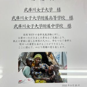 2025年10月1日 / 最終更新日 : 2025年10月3日 三木 社会奉仕活動 国連WFP協会より感謝状 国連WFP協会より、日頃の食料支援活動であるブラウンライスウィーク活動での感謝状が届きました。 ブラウンライスウィーク活動とは。 この活動は、2009年に天皇陛下 (当時皇太子殿下)が本学に行啓された際、イギリス・オック […]